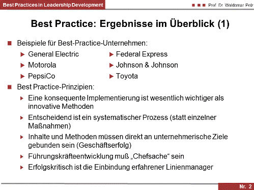 "Best Practice" bedeutet für uns, dass wir mit Methoden und Konzepten arbeiten, die sich durch empirische Studien in der Praxis bereits bewährt haben. Damit will das Leadership-Institut sowohl bei der Diagnose als auch bei der Entwicklung von Führungs- und Managementkompetenzen einen Beitrag zur Umsetzung Ihrer unternehmerischen Ziele leisten. Alle unsere Trainer und Berater haben umfangreiche Praxiserfahrungen und erstklassige Referenzen. Weitere Informationen dazu finden Sie unter den neuen Adresse: Institut für Management-Innovation (und auch unter den oben angegebenen Links).