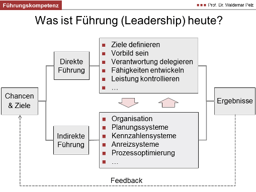 Leadership (Führung): Aus rund 20 verschiedenen Umschreibungen der Begriffe Führung und Leadership resultiert die folgende Definition: "Leadership ist die Ausrichtung der Handlungen und Einstellungen von Menschen und/und Organisationen auf ein gemeinsames Ziel einschließlich Erfolgskontrolle. Diese Umsetzung von Zielen in Ergebnisse erfolgt sowohl direkt (über Personen) als auch indirekt (über Systeme). Führungskräfte müssen demnach über Führungs- und Umsetzungskompetenzen verfügen. Die folgende Grafik veranschaulicht diese Definition des Begriffs Leadership.
